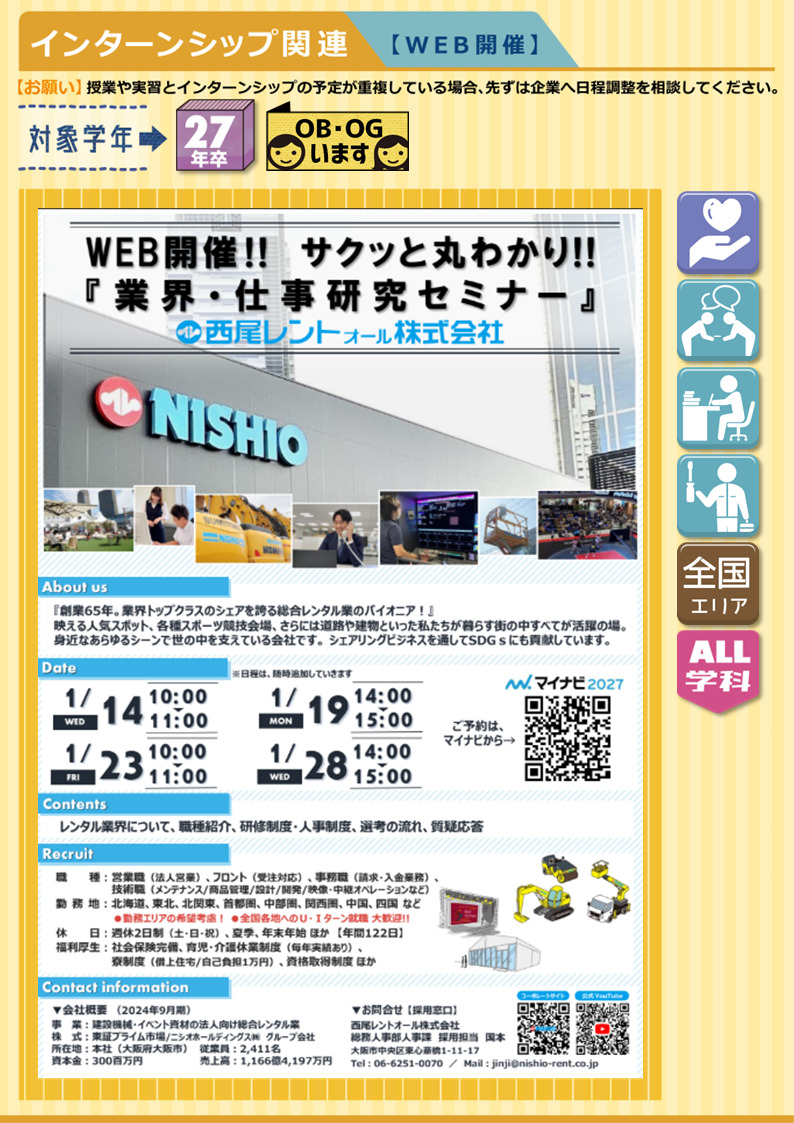 【IS/OC情報】西尾レントオール株式会社《WEB開催》業界・仕事研究セミナー★27年卒 2025.12.26★開催日時⇣⇣1/14㊌⇢⏰10:00-11:00 1/19㊊⇢⏰14:00-15:00 1/23㊎⇢⏰10:00-11:00 1/28㊌⇢⏰14:00-15:00 <内定まで最短2週間>インフラを支える「NISHIO」で一緒に働きませんか?【希望エリア確約・年間休日122日】■ サービス ■《 募集職種:営業職・事務職・技術職 》《 勤務地:全国(エリア別採用・希望勤務地考慮) 》《 募集学科:全学科 》★OBいます▶マイナビ2027 ▶企業HP