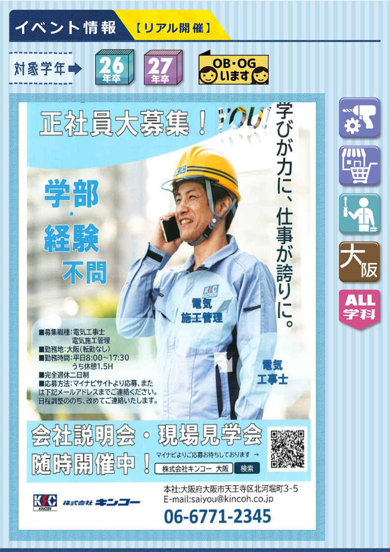 【説明会】株式会社キンコー《対面開催》会社説明会 ★26・27年卒 2025.11.04★随時開催中★大阪の名だたる大型施設・新築ビルはキンコーの元・現場@成長を後押しする社風と働きやすさが強み■ メーカー■《 募集職種:電気工事士・電気施工管理 》《 勤務地:大阪府》《 募集学科:全学科 》★OBいます▶マイナビ2026 ▶企業HP▶採用情報サイト