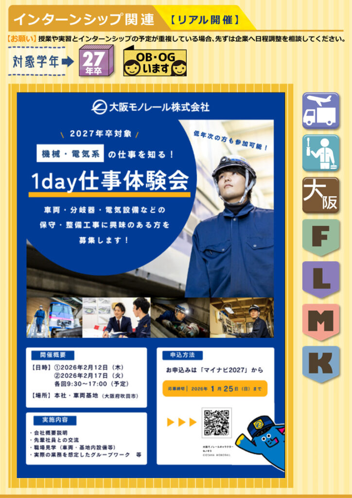 ★開催日時⇣⇣12/19㊎ 10:00~11:30(予定)✔申込締切:12/17㊌※詳しくはチラシQRコード(マイナビ)から! 【鉄道技術職・転勤無し】営業距離日本一の大阪モノレールを運営している鉄道会社で、大阪府が出資する第三セクターです。門真市駅以南の延伸工事が進行中で、新たに5駅が開業予定。沿線には空港や大型商業施設があるほか、大型アリーナ建設等大規模な開発も予定されており、更なる活性化が期待されています。 ■ 輸送 ■ 《 募集職種:事務, 管理, 企画, 設計, 製造, 技術, 施工管理, 総合職(事務系), 総合職(技術系) 》 《 勤務地:大阪府吹田市(転勤無し) 》 《 募集学科:全学科 》★OBいます ▶︎マイナビ2027 ▶︎企業HP