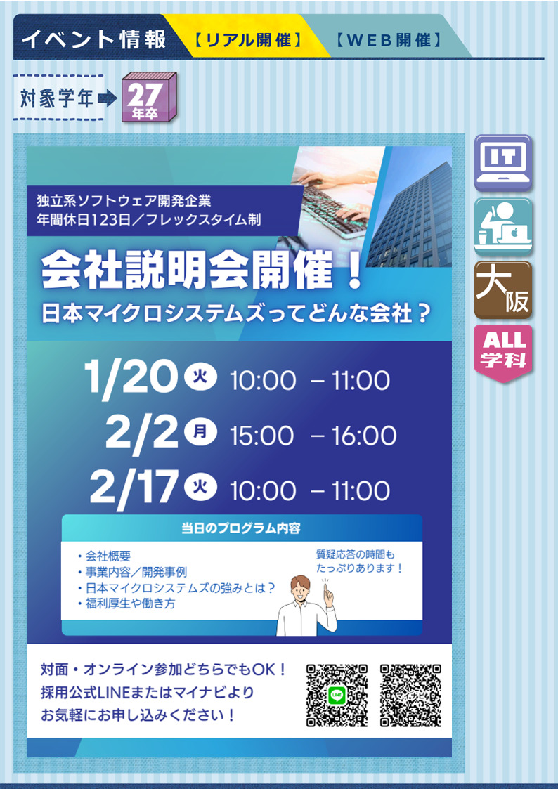 27年卒☆Web開催ありIT・情報通信IT系(PG・SE・クリエーター など)事務・管理・企画 系接客・営業・教育製造・技術・施工管理・設計 系大阪京都兵庫東海九州東京全学科文系P・B・C・EスポーツT機械F交通G都市K電子情報L情報システムH建築M環境理工V
