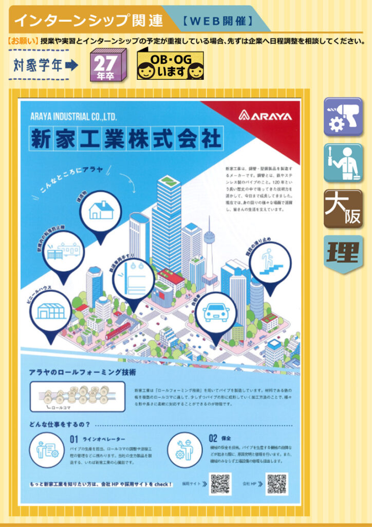 ★随時開催中★ 理系学生の皆様を対象に、1DAYインターンシップ(所要時間:約1時間)を開催しております。 当日は、技術部門の先輩社員が業務内容をご紹介し、簡単なワークにも取り組んでいただく予定です。 本インターンシップは、早期選考に直結するプログラムとなっております。 ご興味のある方は、下記メールアドレスまでお気軽にご連絡ください。 【soumu-jinji@araya-kk.co.jp】 高密度・高性能の鋼管製品を多分野へ展開。年間休日127日・残業月10時間未満で働きやすさ抜群。新家工業で安定した社会人生活を! ■ 製造業 ■ 《 募集職種:設計, 製造, 技術, 総合職(技術系)》 《 勤務地:大阪》 《 募集学科:建築・環境デザイン学科, 環境理工学科, 機械工学科, 交通機械工学科, 都市創造工学科, 電子情報通信工学科※2023年4月~「電気電子情報工学科」に学科名称変更 》 ★OBいます ▶︎RE就活 ▶︎企業HP