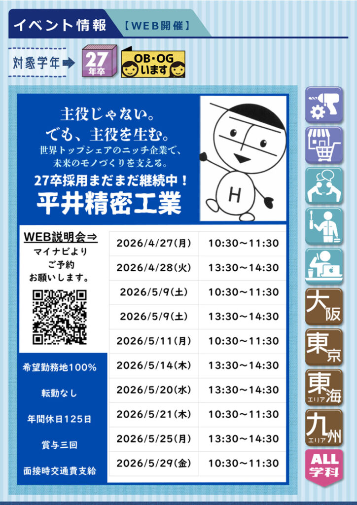 ★開催日時⇣⇣◎オンライン5月1日㊎,7日㊍,11日㊊,15日㊎,19日㊋,22日㊎,26日㊋,29日㊎◎対面(ショールーム見学)5月13日㊌,27日㊌⇢⏰全日14:00~16:00 (希望者のみ選考あり) 【国内シェアトップクラス】調剤機器やシステムで医療機関や調剤薬局をサポート。人・地球・社会に貢献する企業を目指し、更なるチャレンジを続けます!医療・薬科機器で国内シェアトップクラスのメーカーで新たな世界を覗いてみませんか? ■ メーカー ■ 《 募集職種:営業職・技術職・開発職・SS 》 《 勤務地:全国 》 《 募集学科:全学科 》★OBいます ▶︎マイナビ2027 ▶︎企業HP