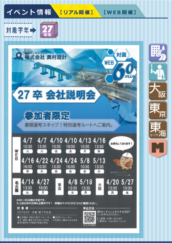 27年卒☆Web開催あり土木・建築接客・営業・教育製造・技術・施工管理・設計 系IT系(PG・SE・クリエーター など)大阪関東東京全学科文系P・B・C・EスポーツT機械F交通G都市K電子情報L情報システムH建築M環境理工V
