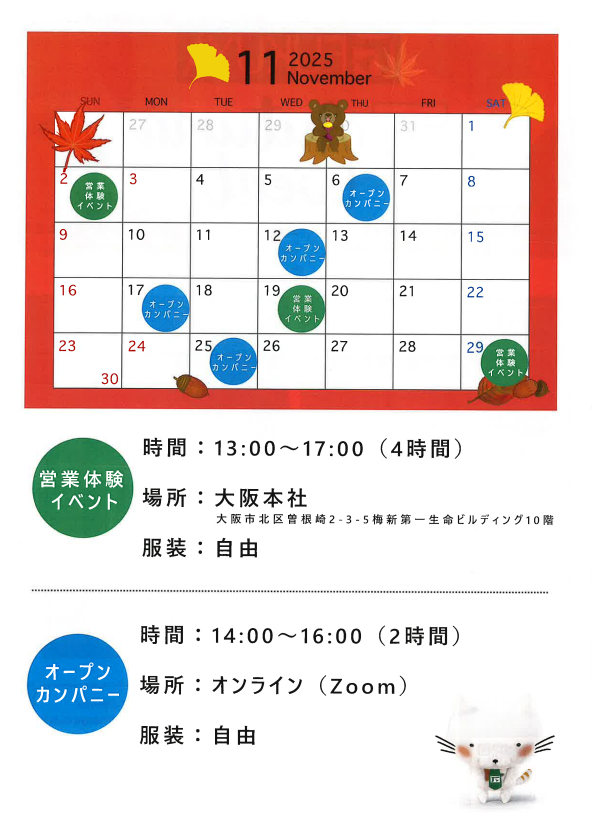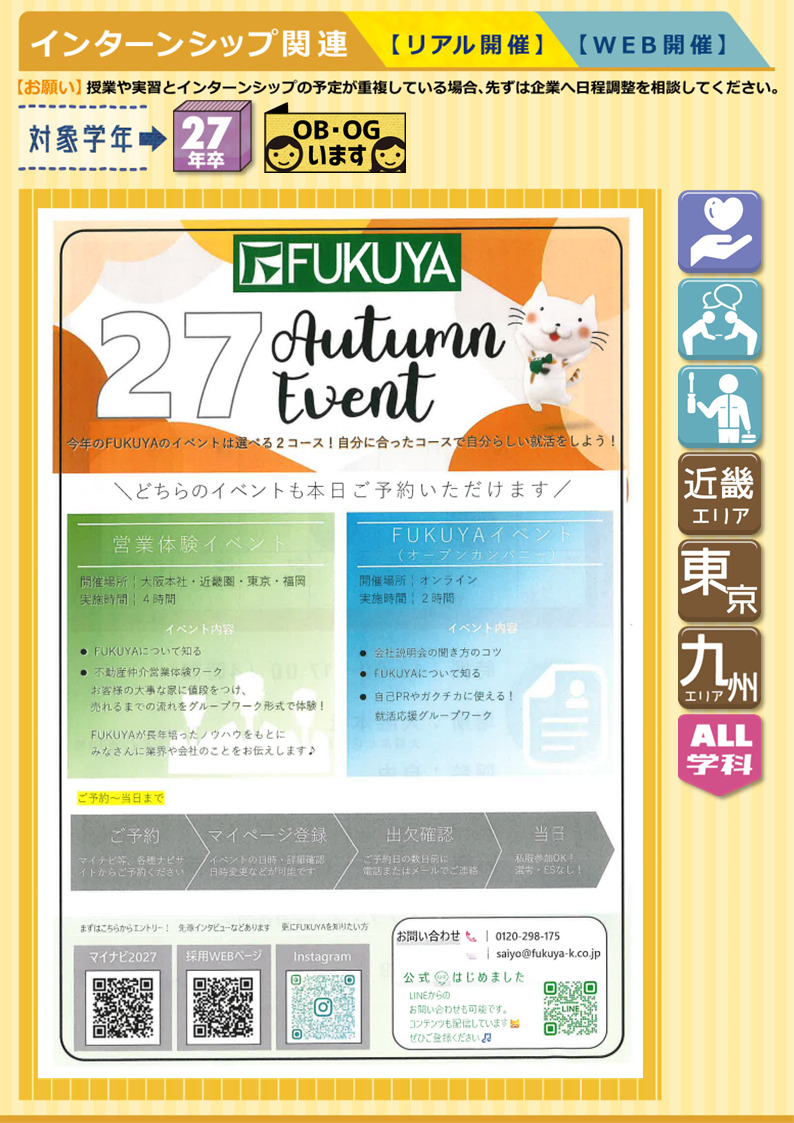 【IS/OC情報】FUKUYAグループ《WEB・対面開催》営業体験イベント・オープンカンパニー★27年卒 2025.11.10★開催日時⇣⇣◎営業体験 🚩大阪本社11/19㊌・11/29㊏⇢⏰13:00-17:00◎オープンカンパニー 🚩ZOOM11/12㊌・11/17㊊・11/25㊋⇢⏰14:00-16:00【関西店舗数No.1】60年間、関西の住まいを支え続けている会社です■ サービス業 ■《 募集職種:営業職(仲介/新築・リフォーム)・施工管理職・設計職 》《 勤務地:近畿圏・福岡県・東京都 》《 募集学科:全学科 》★OBいます▶マイナビ2027 ▶企業HP▶採用情報サイト