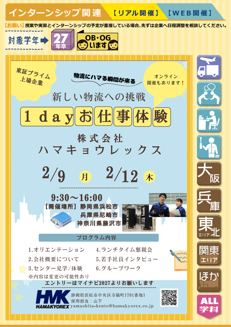 【IS/OC情報】株式会社ハマキョウレックス《WEB・対面開催》1DAYお仕事体験★27年卒 2025.12.16★開催日時⇣⇣2/9㊊・12㊍⇢⏰各日9:30〜16:00勢いのある物流業界を牽引!若手が活躍できるチャンスが豊富な会社です!■ 輸送 ■《 募集職種:配送・物流関連職 》《 勤務地:茨城県/群馬県/埼玉県/千葉県/神奈川県/静岡県/愛知県/大阪府/兵庫県/山口県 》《 募集学科:全学科 》★OBいます▶︎マイナビ2027 ▶︎企業HP