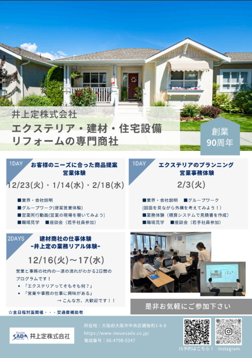 【2DAYS】<建材商社の仕事体験ー井上定の業務リアル体験>12/16㊋~17㊌13:00~17:00 会場:本町本社 ※予約はチラシQRコードから!