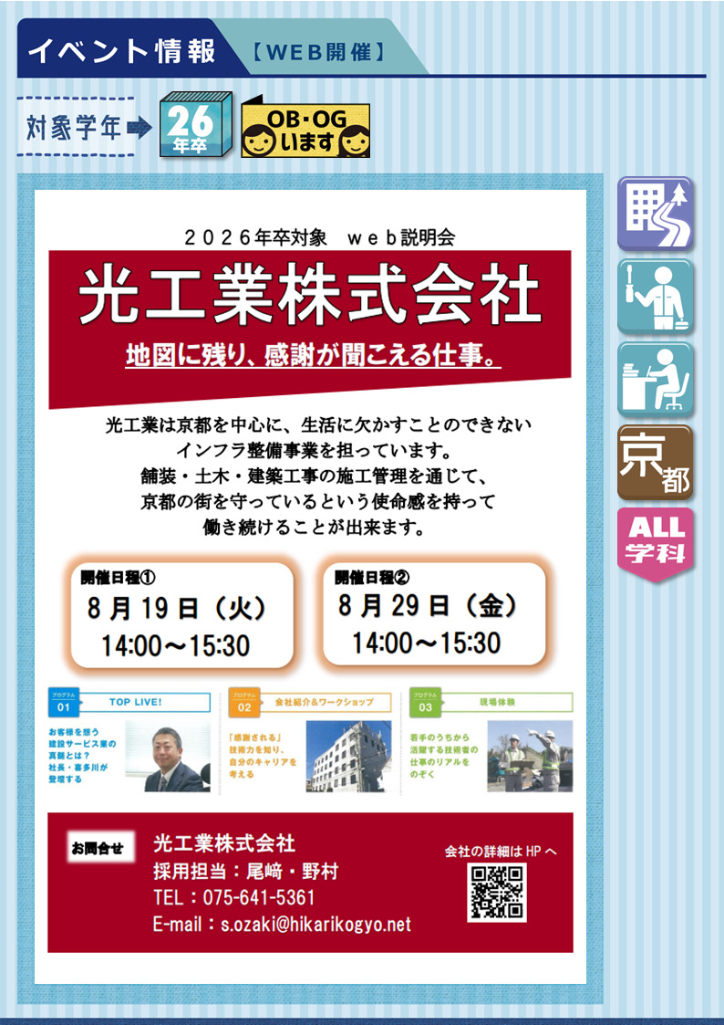 【説明会】光工業株式会社《WEB開催》会社説明会 in8月 ★26年卒 2025.08.05★開催日時⇣⇣8/19㊋⇢⏰14:00~15:30、8/29㊎⇢⏰14:00~15:30「感謝が聞こえる」仕事。京都の街を60年以上に渡り支えてきた総合建設会社。インフラを支えているだけでなく、京都に暮らす人々に寄り添った会社です。■ 建設業 ■《 募集職種:技術系総合職/施工管理者 》《 勤務地:京都府 》《 募集学科 : 全学科 》★OBいます▶︎マイナビ2026 ▶︎企業HP