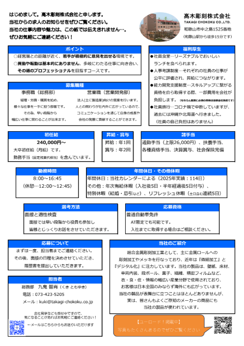 【求人】髙木彫刻株式会社《営業職, 事務職, 管理職, 製造職》募集!★26年卒 2025.09.16★積極的に募集中★総務部or営業開発部で働く仲間を募集しています!総務部は事務職の枠に囚われず会社全体を見渡すお仕事です。営業開発部はお客様と製造部門の橋渡し役を担います。 当社が作っているのは金属ロールなんですが…用途をここで説明するのは難しい!ぜひとも一度説明会へお越しください!お気軽にどうぞ!■ 製造業 ■《募集職種:営業, 事務, 管理, 製造 》《勤務地:和歌山県和歌山市 》《募集学科:全学科 》▶採用情報ページ ▶︎企業HP