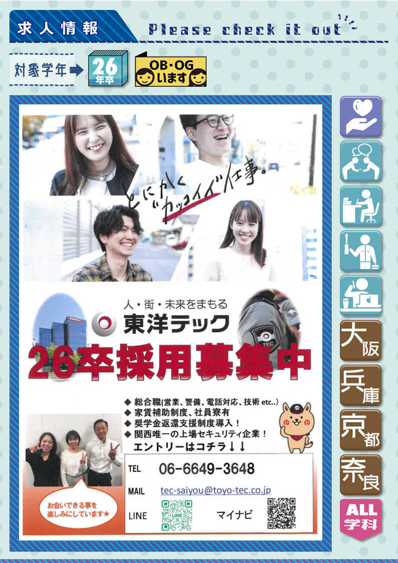 【求人】東洋テック株式会社《営業職、営業事務職、オペレーター職、SE職、技術職》募集!★26年卒 2025.09.26★積極的に募集中★東証スタンダード上場!関西トップクラスの総合セキュリティーカンパニー!上場企業で唯一、関西に本社を構え、警備業界の歴史と関西の「安心・安全」を守り続けています!■ サービス ■《 募集職種 》営業、営業事務、オペレーター、SE、技術《 勤務地 》京都府・大阪府・兵庫県・奈良県《 募集学科:全学科 》 ★OBいます▶マイナビ2026 ▶企業HP