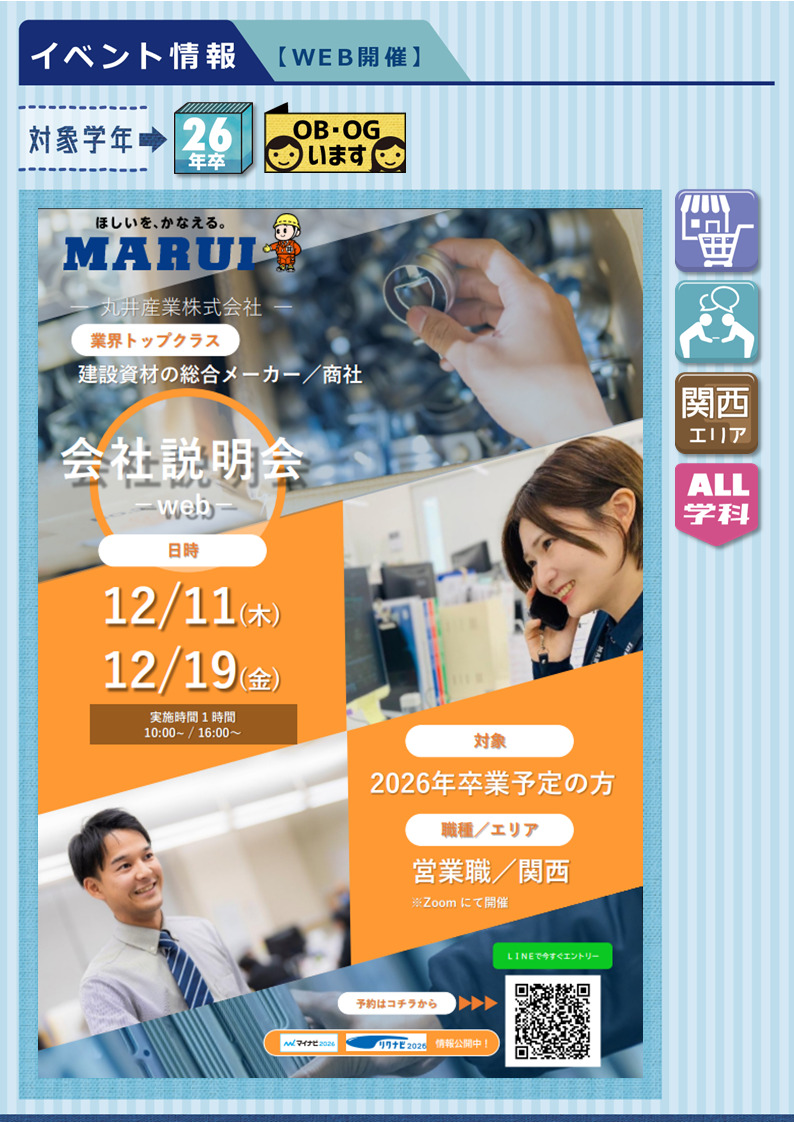 【説明会】丸井産業株式会社《WEB開催》会社説明会 ★26年卒 2025.12.02★開催日時⇣⇣◎営業職12/11㊍・12/19㊎⇢⏰10:00-11:00・16:00-17:00◎事務職 🚩勤務予定地:兵庫県姫路12/11㊍・12/19㊎⇢⏰14:00-15:00【完全週休2日・年間賞与10ヶ月以上支給】働きやすい環境を整備し、建築分野での社会貢献と社員の自己実現を目指しています■ 商社 ■《 募集職種:営業職・事務職 》《 勤務地:関西 》《 募集学科:全学科 》★OBいます▶マイナビ2026 ▶企業HP⇣⇣ 事務職 ⇣⇣