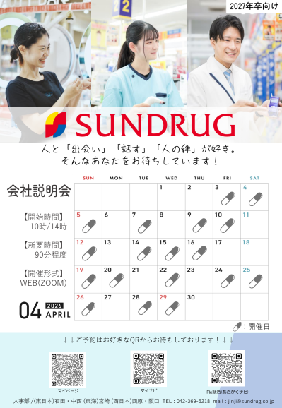 【説明会】株式会社サンドラッグ《WEB開催》会社説明会★27年卒 2026.04.06★開催日時⇣⇣直近開催4/7㊋⇢⏰10:00~ or 14:00~(90分程度)🚩zoom開催✸4月多数日開催!詳しくはチラシ参照!➤予約はお好きなチラシQRコードより!芽吹け!!あなたらしく、伸びやかに。■ 流通 ■《 募集職種:オペレーション職/ビューティーアドバイザー職 》《 勤務地:全国(地域採用あり) 》《 募集学科:全学科 》★OBいます▶マイナビ2027 ▶企業HP