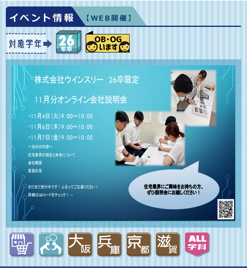 【セミナー】株式会社ウインスリー《WEB開催》11月分オンライン会社説明会★26年卒 2025.10.27★開催日時★11/4㊋ ・6㊍・7㊎⇢⏰9:00-10:00【勤務地/職種確約!】健康的で快適な住空間づくりと地域社会の景観の美しさや調和にも貢献する、LIXIL販売代理店です!■ 商社 ■《 募集職種 : 営業職 》《 勤務地:滋賀県 京都府 大阪府 兵庫県 》《 募集学科:全学科 》★OBいます▶︎マイナビ2026 ▶︎企業HP