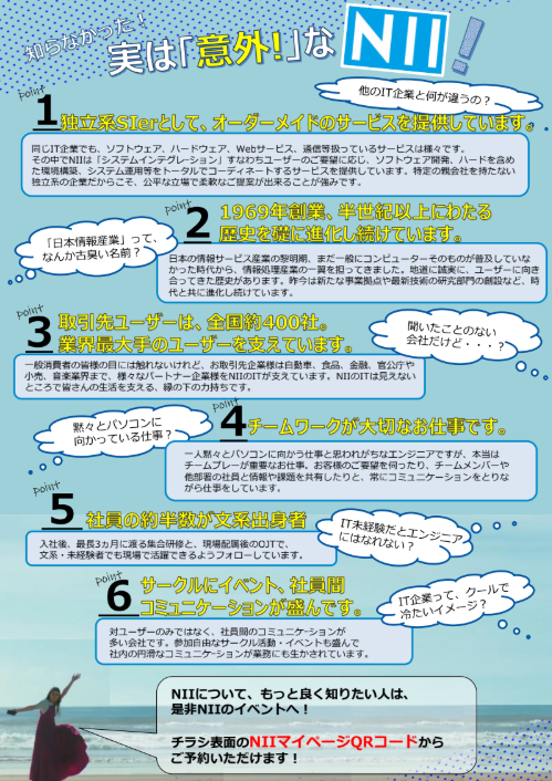 弊社は、1969年創業の老舗IT企業です。 食品、自動車、金融、音楽など、幅広い業界のお客様のお仕事を見えないところで支えています。 人々の365日をITのチカラで支え、そしてその先の未来をはぐくむ会社、それが私たちNIIです。