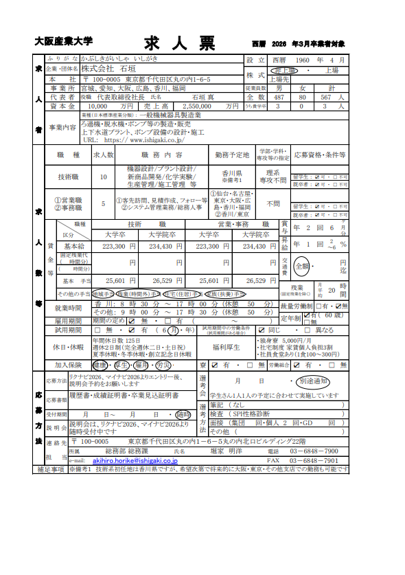 【求人】株式会社石垣《技術職・営業職・事務職》募集!★26年卒 2025.11.20★積極的に募集中★当社は、水インフラと産業を支える機械メーカーです。【石垣の強み】技術力・チーム力・安定性 地球環境と人々の暮らしを守る技術で、世の中に貢献していきます。ご興味を持っていただけましたら、マイナビからweb説明会にお越しください。若手採用担当が分かりやすくご説明いたします♪■ メーカー ■《 募集職種:技術職・営業職・事務職 》《 勤務地:東京都・大阪府・香川県 》《 募集学科:全学科 》★OBいます▶マイナビ2026 ▶企業HP⇣⇣求人票⇣⇣