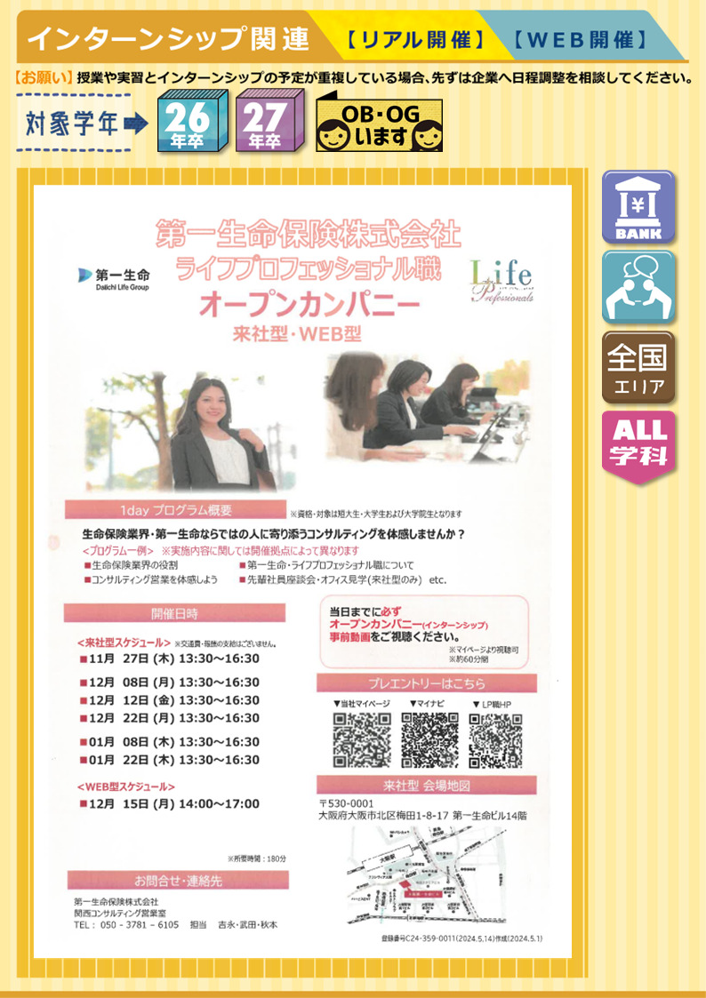 【IS/OC情報】第一生命保険株式会社(関西コンサルティング営業室)《WEB・対面開催》オープンカンパニー★26年+27年卒 2025.12.04★開催日時⇣⇣◎対面 🚩大阪12/8㊊・12/12㊎・12/22㊊・1/8㊍・1/22㊍⇢⏰13:30-16:30◎WEB12/15㊊⇢⏰14:00-17:00人生をまもる会社から、人生をひろげる会社へ。■ 金融 ■《 募集職種:ライフプロフェッショナル職 》《 勤務地:全国 》《 募集学科:全学科 》★OBいます▶マイナビ2026 ▶マイナビ2027▶企業HP