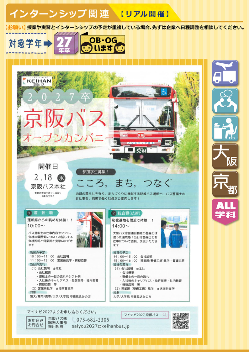 【IS/OC情報】京阪バス株式会社《対面開催》オープンカンパニー★27年卒 2025.12.11★開催日時⇣⇣2/18㊌ ①運転職⇢⏰10:00~ ②総合職(技術)⇢⏰14:00~ ✔申込締切:2月9日㊊地域の暮らしを安全・快適な輸送で支える企業。皆さまの暮らしに無くてはならない存在として様々な職種で活躍できます。安定の京阪グループ!男性の育児休職および育児目的休暇の取得率100%。転居を伴う異動もなく、地元に貢献できます。■ 輸送 ■《 募集職種:運転職・総合職(技術) 》《 勤務地:京都府南部、大阪北部 》《 募集学科:全学科 》★OBいます▶︎マイナビ2027 ▶︎企業HP
