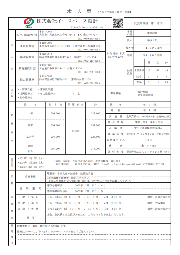 【求人】株式会社イースペース設計《設計》募集! ★27年卒 2026.03.01★積極的に募集中★アットホームな社風。チーム体制で個人の負担減。ライフワークバランスの取れやすい会社。■ 建設業 ■《 募集職種:建設意匠設計者・設計補助・建築図面作成 》《 勤務地:大阪府 》《 募集学科:建築・環境デザイン学科 》▶採用情報ページ ▶企業HP