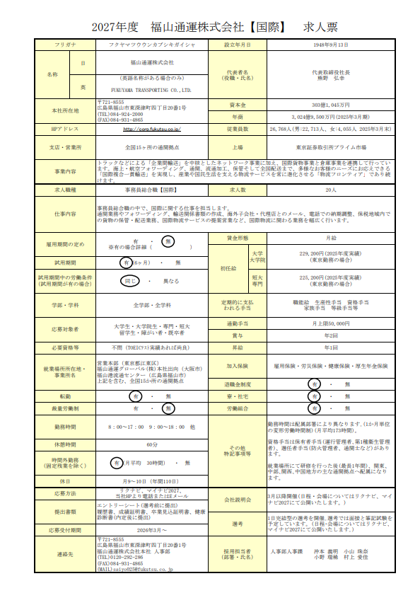 【求人】福山通運株式会社《事務員総合職・SE・ドライバー・整備士》募集!★27年卒 2026.03.01★積極的に募集中★国内を、そして海外をつなぐネットワーク。今日も、今こうしている間にも福山通運は日本の物流を支え続けています。■ 輸送 ■《 募集職種: 事務員総合職・SE・ドライバー・整備士等 》《 勤務地:全国 》《 募集学科:全学科 》★OBいます▶︎マイナビ2027 ▶︎企業HP⇣⇣ 求人票 ⇣⇣