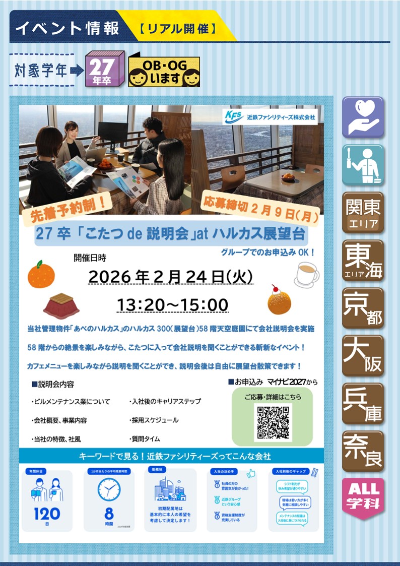 【説明会】近鉄ファシリティーズ株式会社《対面開催》こたつde説明会atハルカス展望台★27年卒 2026.01.26★開催日時⇣⇣2/24㊋⇢⏰13:20~15:00(締切:2/9㊊)@あべのハルカス58階天空庭園※グループでのお申込OK!詳細・申込はチラシQRコード(マイナビ)から!より快適、より安全な社会を私たちの手で《募集職種:総合職、技術系総合職》《勤務地:茨城県/千葉県/東京都/愛知県/三重県/京都府/大阪府/兵庫県/奈良県》《募集学科:全学生》▶マイナビ2027▶企業HP