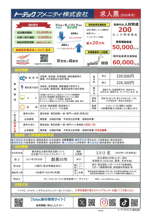 【求人】トーテックアメニティ株式会社《営業職》募集!★26年卒 2026.01.29★積極的に募集中★創業54年の安定企業。ITとモノづくりの分野で快適な社会づくりに貢献しています!■ 情報通信 ■《 募集職種 :器械設計・電気電子設計・SE・営業)》《 勤務地:希望勤務地考慮(全国)》《 募集学科:情報通信 》★OBいます▶マイナビ2026 ▶企業HP