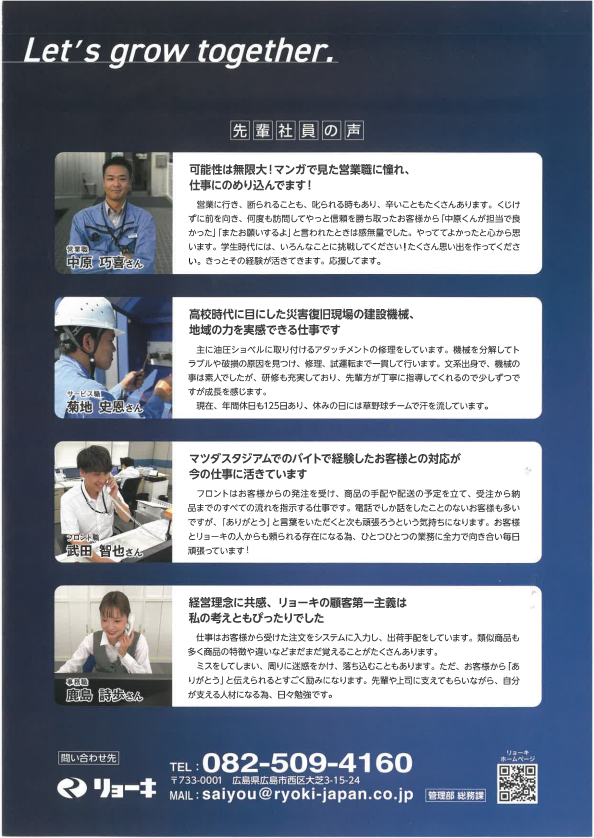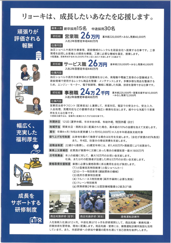 【求人】株式会社リョーキ《営業職, 事務職, 技術職》募集!★26年卒 2026.02.04★積極的に募集中★株式会社リョーキは建設機械レンタルを通じて地域インフラを支える安定成長企業。若手が早期に活躍できるよう12か月間の研修カリキュラムをもとに大きく成長できる環境が整っています。■ サービス ■《 募集職種:営業, 事務, 技術 》《 勤務地:兵庫県神戸市、尼崎市、西宮市、三木市 》《 募集学科:全学科 》★OBいます▶マイナビ2026 ▶企業HP