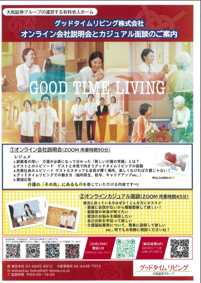 【IS/OC情報】グッドタイムリビング株式会社《WEB・対面開催》職場見学 ★27年卒 2026.02.27★開催日時⇣⇣詳細は、マイナビ2027から!!日本における”グッドタイム(人生最良のとき)”の普遍化 ~第三の人生と言われる老後が「人生で一番良かった時間」となるよう、私たちと一緒に取り組みませんか~■ サービス業 ■《 募集職種 : 介護スタッフ》《 勤務地:埼玉・千葉・東京・神奈川・京都・大阪・兵庫 》《 募集学科:全学科》★OBいます▶︎マイナビ2027 ▶︎企業HP