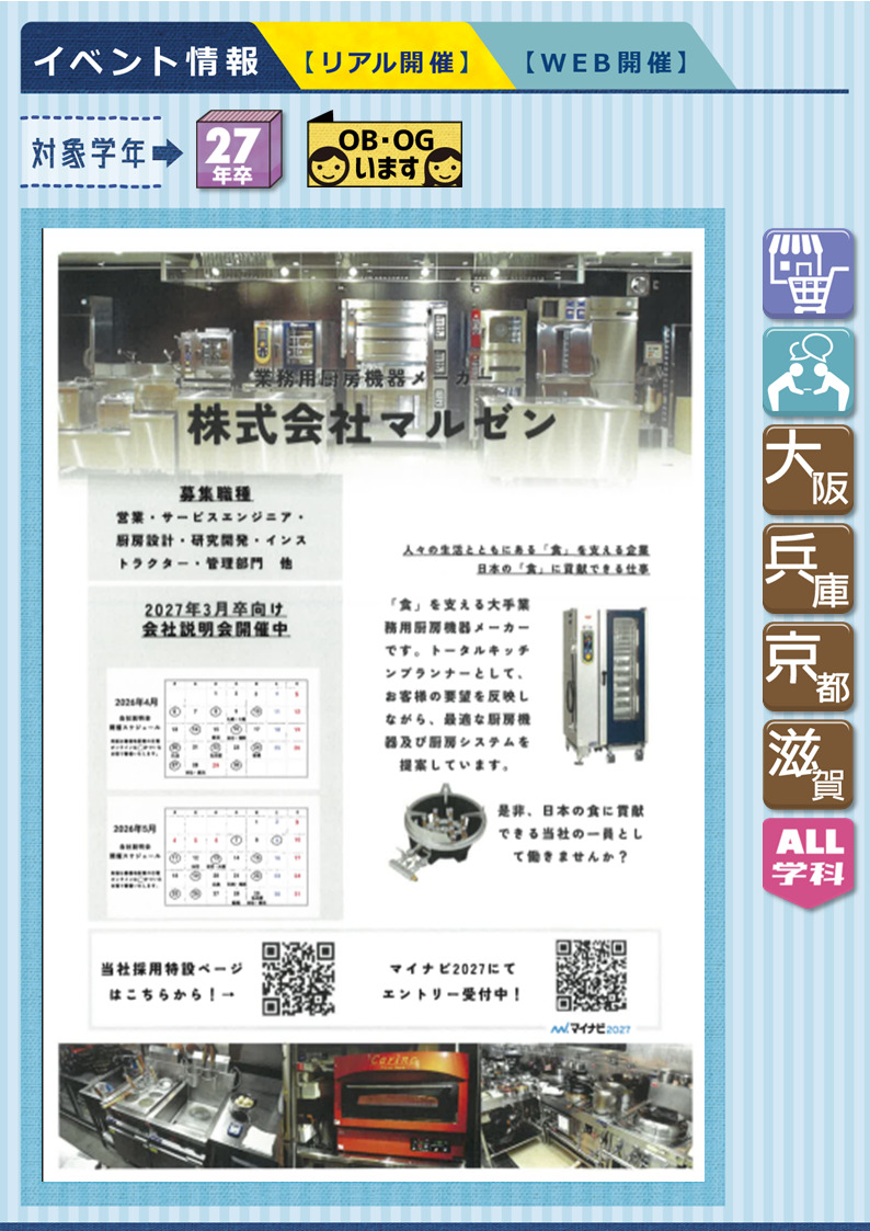【説明会】株式会社マルゼン《WEB・対面開催》会社説明会 ★27年卒 2026.04.09★開催日時はチラシをチェック✔【年間休日121日/地域別採用】日本の「食」を支える、厨房機器のマルゼン■ 商社 ■《 募集職種 : 営業職 》《 勤務地:近畿:大阪府(大阪市阿波座)、豊中市、東大阪市、兵庫県(神戸市、姫路市)京都府、滋賀県》《 募集学科:全学科 》★OBいます▶︎マイナビ2027 ▶︎企業HP
