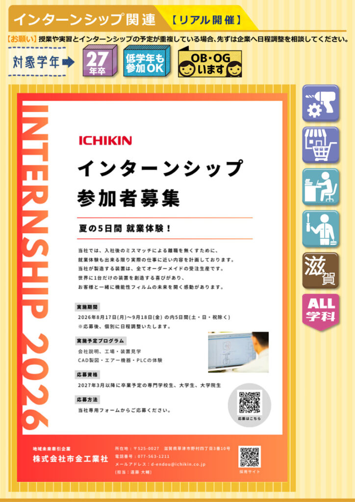 【インターンシップ&仕事体験 】情報27年卒流通・販売製造接客・営業・教育IT系(PG・SE・クリエーター など)製造・技術・施工管理・設計 系事務・管理・企画 系大阪北陸九州東京全学科文系P・B・C・EスポーツT機械F交通G都市K電子情報L情報システムH建築M環境理工V