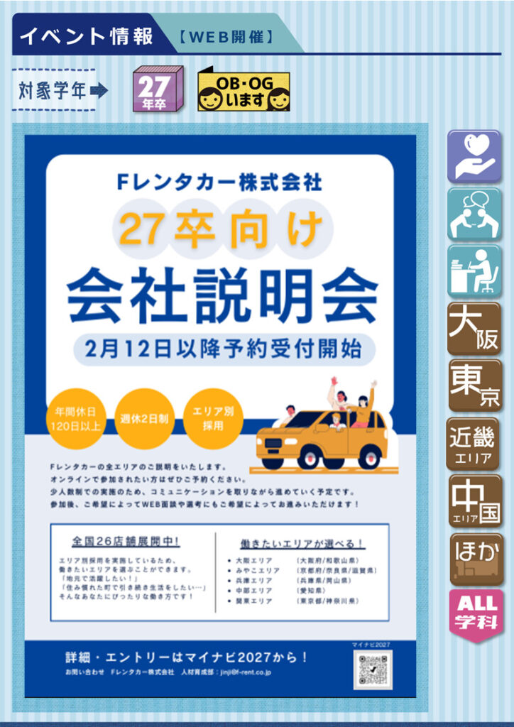 【インターンシップ&仕事体験 】情報27年卒☆Web開催あり流通・販売製造製造・技術・施工管理・設計 系接客・営業・教育事務・管理・企画 系大阪中部滋賀和歌山京都兵庫奈良ほか~その他の都道府県~関西関東東北北陸東海中国四国九州東京近畿全学科文系P・B・C・EスポーツT機械F交通G都市K電子情報L情報システムH建築M環境理工V